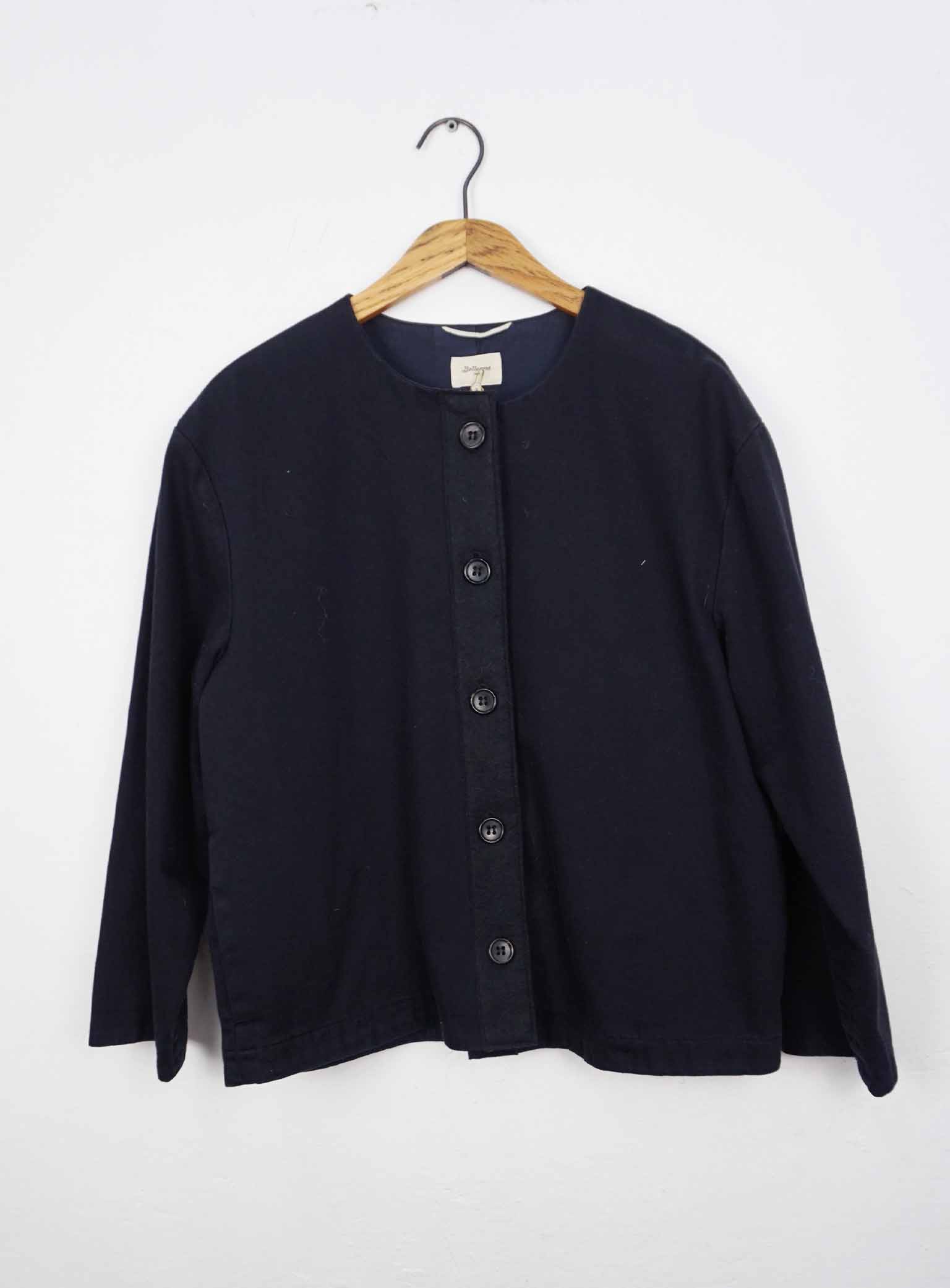 Blazer de color azul oscuro con corte recto. Tiene cuello redondo, cierre de botones y bolsillos exteriores.