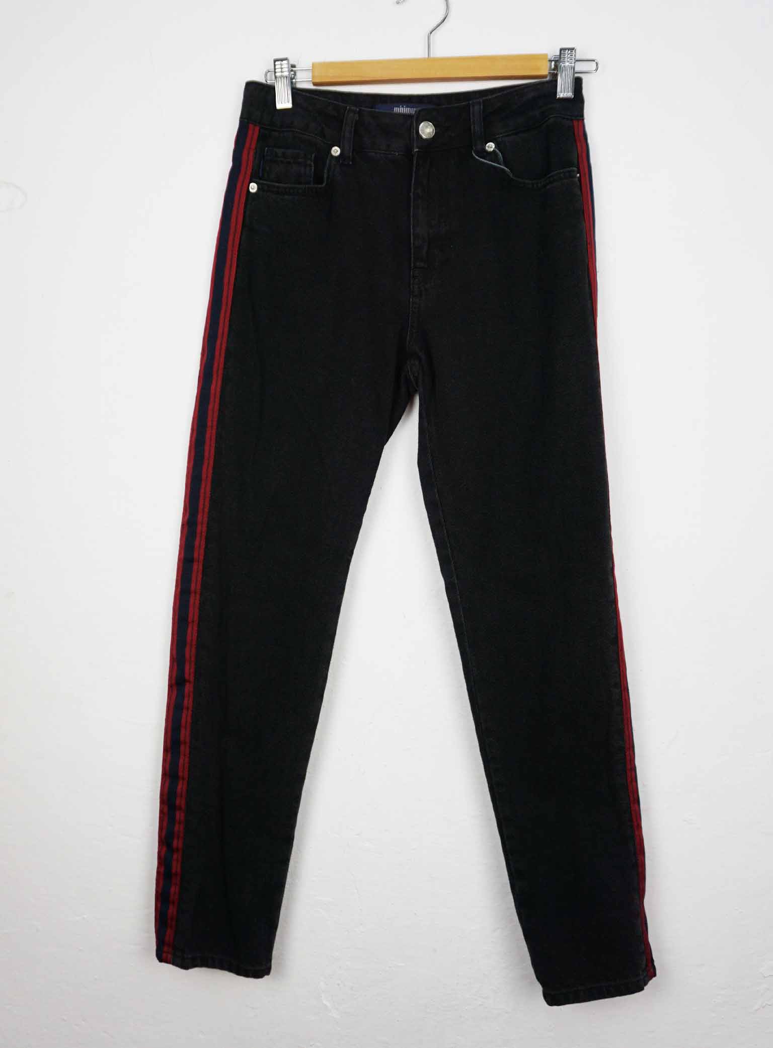 Pantalón vaquero negro de tiro alto, con rayas en los laterales y cierre de cremallera y botón metálico. Cinco bolsillos. 100% Algodón