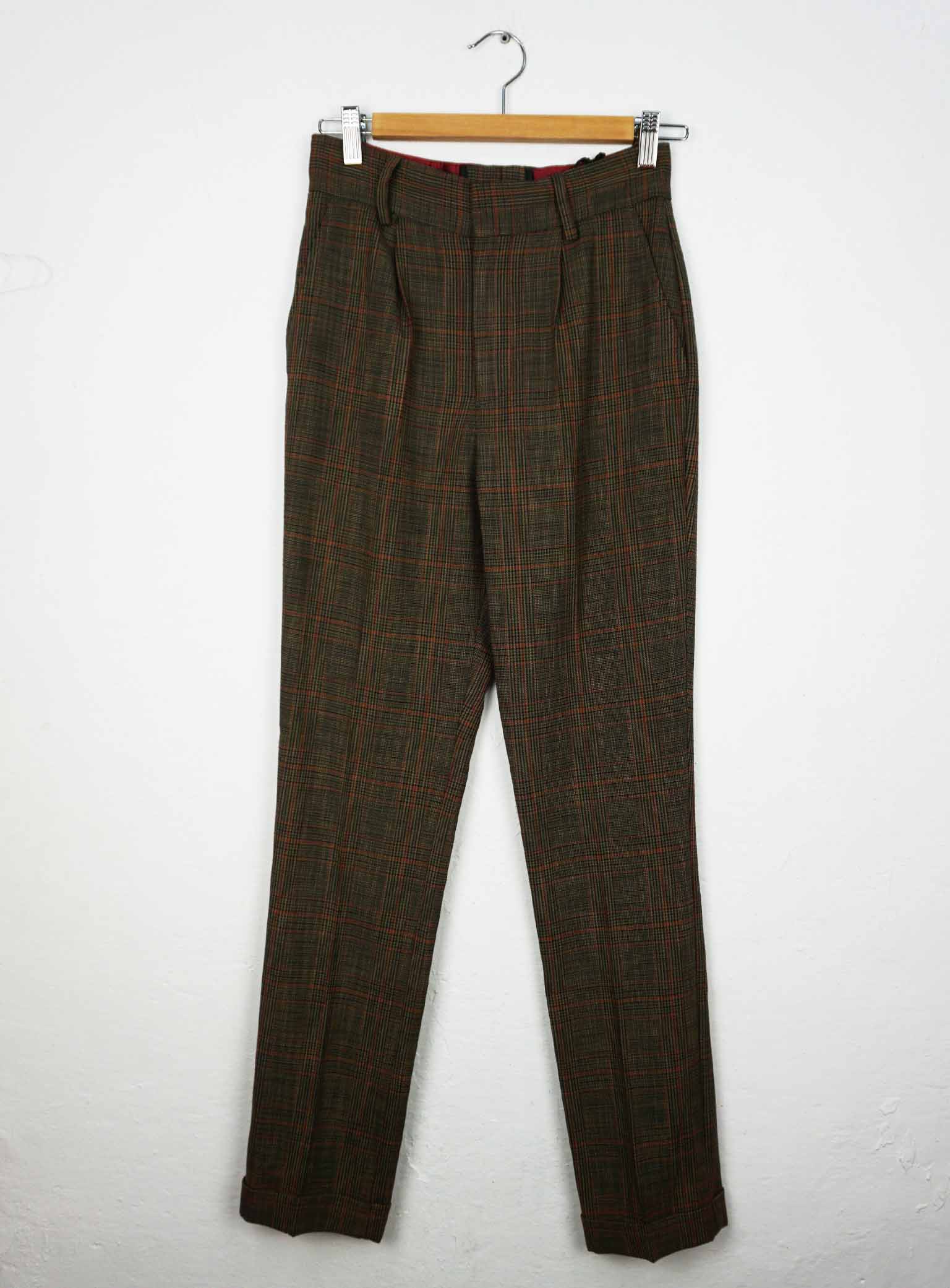 Pantalón de traje con rayas horizontales y verticales y bajo recogido. Cierre de cremallera, botón y corchete. Bolsillos laterales y traseros. Tiro alto. 63% Viscosa, 36% Poliéster, 1% Elastano