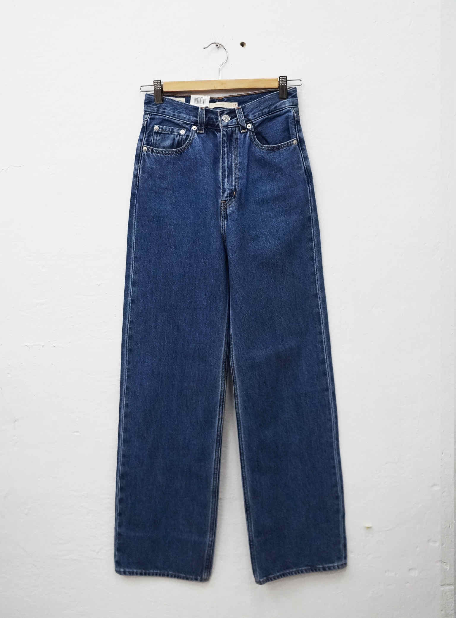 Pantalón vaquero ajustado en la cintura y muslos, pero con la pierna muy holgada. Tiro muy alto. No elástico. Cierre de cremallera y botón metálico. Hebillas y cinco bolsillos: tres delanteros y dos traseros. 77% Algodón, 23% Cáñamo
