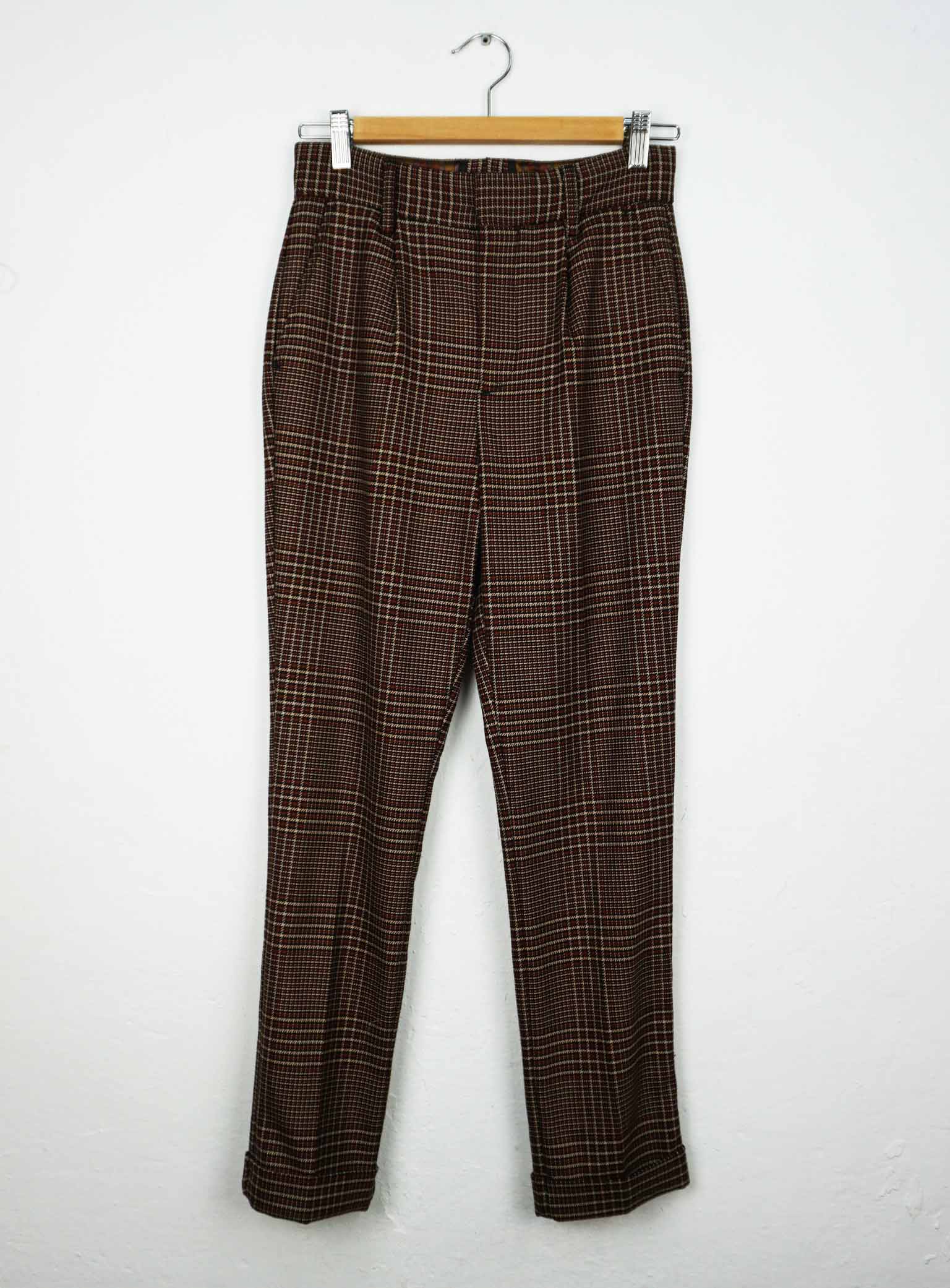 Pantalón de traje con cuadros/pata de gallo y bajo recogido. Cierre de cremallera, botón y corchete. Bolsillos laterales y traseros. Tiro alto. 63% Viscosa, 36% Poliéster, 1% Elastano