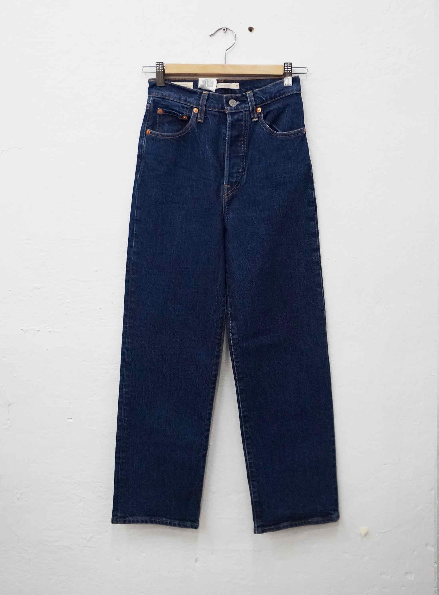 Pantalón vaquero oscuro de tiro muy alto y corte recto. Ceñido en la cadera y muslos. No elástico. Cierre de botonadura metálica. Hebillas y cinco botones: tres delanteros y dos traseros. 79% algodón, 21% lyocell